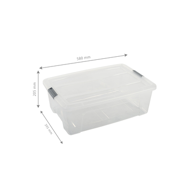 De Iris opbergbox Click New Top Box is een handige transparante opbergbox voor allerlei spullen. De box van 30 liter is extra goed verstevigd door een sterke structuur en afsluitbaar met 2 klipsluitingen. De boxen zijn stabiel te stapelen en het design van de opbergbox zorgt ervoor dat je een handige grip hebt onderaan. Daardoor kan je de box makkelijk op een hoogte plaatsen. Deze nestbare New Top Box is 395 mm lang, 575 mm breed en 205 mm hoog.