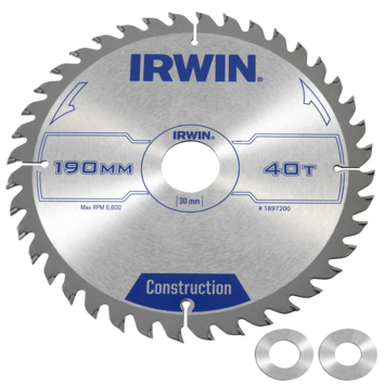 Irwin cirkelzaagblad Ø190 mm. Inclusief reduceerringen waardoor geschikt voor asgat 16, 20 en 30 mm, vertanding 40T