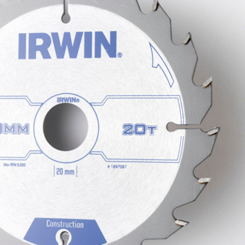 IRWIN cirkelzaagblad nr. 1897087 is een T.C.T. zaagblad met een diameter van 130mm en een asgat van 20mm. Door de grove vertanding (20T) zaag je sneller door houten platen en is de afwerking wat ruw. Het blad heeft een dunne zaagsnede (2,5mm) met wisselende EVO tanden om nog sneller te kunnen zagen. De hardmetalen carbide punten van industriële kwaliteit blijven langer scherp en gaan langer mee