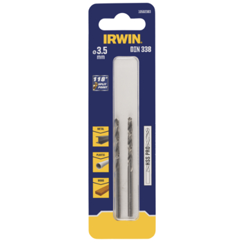 IRWIN HSS PRO boor 10502383 is een metaalboor met de volgende afmetingen: Ø 3.5mm / werklengte 39mm / totale lengte 70mm. Inhoud: 2 stuks. HSS PRO metaalboren van IRWIN zijn van industriële kwaliteit en bij iedere klusser geliefd om hun veelzijdigheid. Naast gietijzer, staal en andere ijzerlegeringen ook zeer geschikt voor het boren in allerlei non-ferromaterialen, kunststof, pvc en hout. De boorkop is geslepen in 118° wat zorgt voor uitstekende zelfcentrerende eigenschappen. Hierdoor zal de boor minder snel wegglijden. HSS PRO boren van IRWIN hebben een hoge elasticiteit waardoor ze minder snel breken, ook bij kleine diameters. Voldoen aan kwaliteitsnorm DIN 338. Geschikt voor alle gangbare gesnoerde boormachines en accuboormachines.