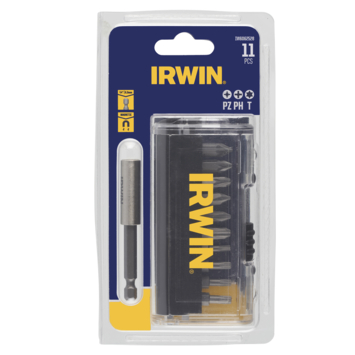 IRWIN schroefbitset IW6062528 is een 10-delige bitset bestaande uit de meest gangbare Phillips (PH), Pozidriv (PZ) and Torx (T) schroefbits + schroefbithouder. In een overzichtelijke, compacte houder om altijd bij de hand te hebben. De schroefbithouder zit los in de verpakking,. Deze kun je echter ook opbergen in de set. In het scharniergedeelte zit een ruimte waarin deze past. Te openen met een schuifklepje.