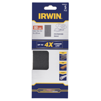 Irwin 1/3vel schuurgaas IW8084013 is geschikt voor alle vlakschuurmachines met schuurzoolafmeting 189x91mm en klembevestiging. Het schuurgaas heeft korrelgrootte 80. Dit zorgt voor een grove afwerking, maar schuurt wel lekker snel. Afmeting schuurstrook: 230x93mm. Inhoud: 5 stuks. Gewoon schuurpapier verstopt snel waardoor de schuurprestatie afneemt en je tijdens je klus regelmatig het schuurpapier moet vervangen. Piranha schuurGAAS gaat 4x langer mee dan gewoon schuurpapier. Door de open structuur blijft de stofafzuiging optimaal en loopt het schuurgaas niet zo snel vol. Piranha schuurgaas is herbruikbaar doordat je het kunt schoonkloppen en afspoelen. Een ander voordeel van de open structuur is dat schuurgaas op elk merk/type schuurmachine past. Je hoeft namelijk geen rekening te houden met het gatenpatroon in de schuurzool van je schuurmachine.