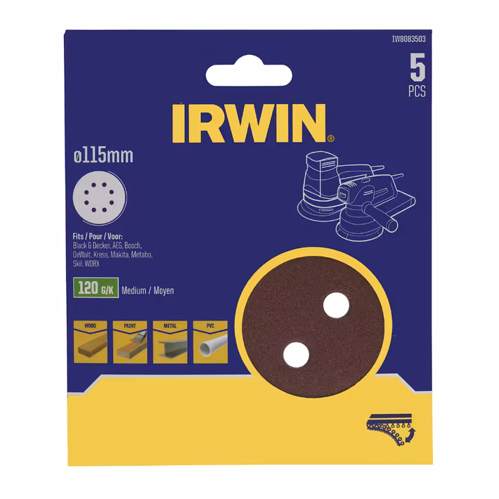 Irwin schuurschijven IW8083503 zijn geschikt voor excentrische schuurmachines met een ronde schuurzool met een diameter van 115mm. De schuurvellen hebben korrelgrootte 120. Dit geeft een medium resultaat. Dankzij de zelfhechtende laag en klittenbandbevestiging zijn de schuurstroken eenvoudig te bevestigen en is er nauwelijks speling tussen schuurvel en machine. Dat zorgt voor een hogere afname. Inhoud: 5 stuks.