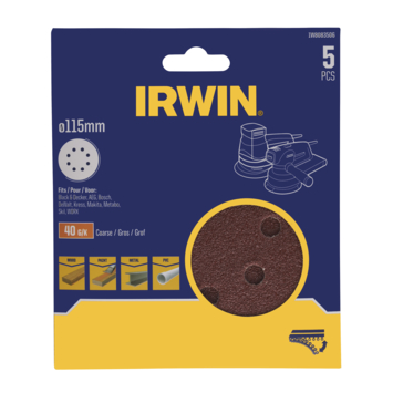 Irwin schuurschijven IW8083506 zijn geschikt voor excentrische schuurmachines met een ronde schuurzool met een diameter van 115mm. De schuurvellen hebben korrelgrootte 40. Dit zorgt voor een zeer grove afwerking, maar schuurt wel lekker snel. Dankzij de zelfhechtende laag en klittenbandbevestiging zijn de schuurstroken eenvoudig te bevestigen en is er nauwelijks speling tussen schuurvel en machine. Dat zorgt voor een hogere afname. Inhoud: 5 stuks.
