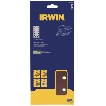 Irwin 1/2vel schuurstroken IW8083105 zijn geschikt voor vlakschuurmachines van Bosch, AEG, Makita, Metabo, Lux, Festool met schuurzoolafmeting 115x230mm en klittenbandbevestiging. De schuurvellen hebben korrelgrootte 150. Dit zorgt voor een medium/fijne afwerking. Dankzij de klittenbandbevestiging is er nauwelijks speling tussen het schuurvel en de machine waardoor de afname een stuk groter is. De perforatie zorgt voor een goede stofafzuiging waardoor stof minder snel in het schuurpapier blijft zitten. Let vooraf goed op of de perforatie overeenkomt met die van je schuurmachine. Afmeting schuurstrook: 115x230mm. Inhoud: 5 stuks.