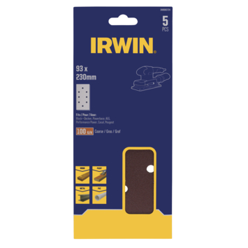 Irwin 1/3vel schuurstroken IW8083734 zijn geschikt voor de meeste Black+Decker, AEG, en Peugeot vlakschuurmachines met schuurzoolafmeting 189x91mm en klembevestiging. De schuurvellen hebben korrelgrootte 100. Dit zorgt voor een medium afwerking. De perforatie zorgt voor een goede stofafzuiging waardoor stof minder snel in het schuurpapier blijft zitten. Let vooraf goed op of de perforatie overeenkomt met die van je schuurmachine. Afmeting schuurstrook: 230x93mm. Inhoud: 5 stuks.