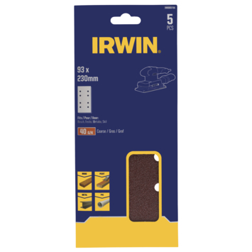 Irwin schuurvel 230 x 93 mm K40 voor klembevestiging, met perforatie voor Bosch, Skil, Gamma, Makita, Metabo, 5 stuks.