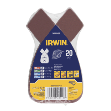 Irwin schuurstroken IW8083406 zijn geschikt voor handpalmschuurmachines van het merk Black+Decker (Mouse KA161, KA168, KA1000, KA2000, BEW230) en Bosch (Primo) met schuurzoolafmeting 130x90mm. Deze voordeelverpakking bestaat uit 20 schuurstroken met verschillende korrelgrootten: 5x K80, 5x K120, 5x K180 en 5x K240. Voor een grove en een fijne afwerking. Dankzij de zelfhechtende laag en klittenbandbevestiging zijn de schuurstroken eenvoudig te bevestigen en is er nauwelijks speling tussen schuurvel en machine. Dat zorgt voor een hogere afname. Het schuurvel wordt geleverd met 2 extra schuurpuntstukken, omdat deze als eerste slijten. Zo kunt u een tijd vooruit. Inhoud: 20 stuks.