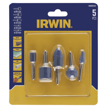 IRWIN slijpsteenset IW8081015 bestaat uit 5 slijpstenen met verschillende vormen voor het bewerken van metaal. De slijpstenen zijn te gebruiken in combinatie met iedere (accu)boormachine. Diameter as: 6mm.
