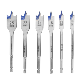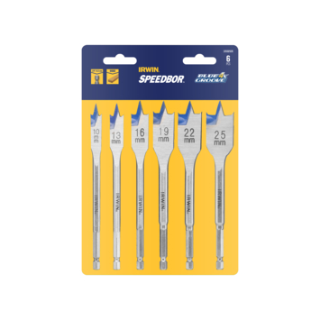 Irwin Blue Groove speedborenset 10502826 is 6-delige set met platte houtboren geschikt voor het boren van gaten met een grote diameter in hout laminaat en spaanplaat De set bestaat uit 6 houtboren met diameter 10 13 16 19 22 en 25mm