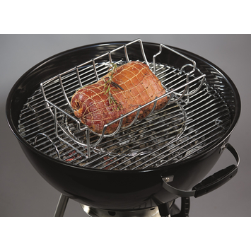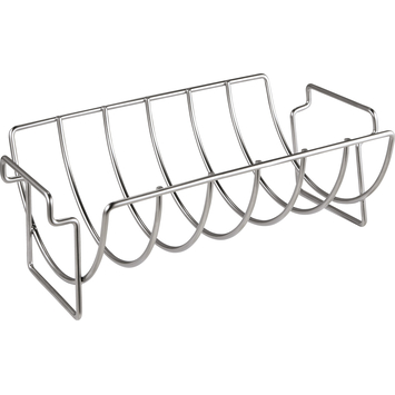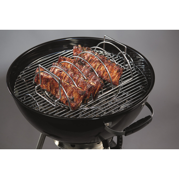 Met dit grillrek bereid je meerdere spareribs tegelijk zonder dat ze aan elkaar plakken of te weinig ruimte krijgen op je BBQ. Ideaal wanneer je grotere hoeveelheden tegelijk wilt garen. Je zet de ribs rechtop in het rek, waardoor de warmte beter verdeeld wordt en alles gelijkmatiger gaart. Je gebruikt het tijdens het barbecueën en bespaart zo ruimte op het rooster. Het rek is gemaakt van roestvrij staal en blijft hittebestendig tijdens gebruik. Dankzij het open ontwerp houd je overzicht en kun je het vlees makkelijk draaien of marineren. De afmetingen zijn 39 bij 25,5 bij 13 cm. Na gebruik maak je het rek snel schoon, zodat het weer klaar is voor de volgende barbecue.