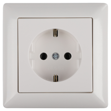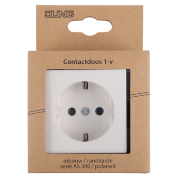 Met deze enkele wandcontactdoos van Jung AS500 kunt u elektrische apparaten aansluiten op netstroom. De ‘aarde’ zorgt ervoor dat, in geval van kapotte- of losgeschoten bedrading in een apparaat (bv. wasmachine of computer), de metalen delen niet onder stroom komen te staan, de stroom wordt dan via een extra aardedraad in de aarde geleid.
