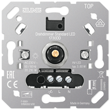 Deze LED dimmer van Jung dimt traploos vrijwel alle 12/230V en dimbare LED lichtbronnen. De basis lichtsterkte is in te stellen door middel van de potentiometer. De dimmer kan LED lampen tussen de 3 en 60 watt dimmen.