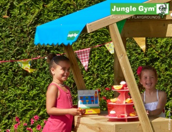Dit klassieke speeltoestel met houten dak stimuleert veel leuke fantasierijke activiteiten, zoals een winkeltje, ijskraam, theater loket of een poppenkast voorstelling. Daarnaast zijn er nog allerlei andere speelmogelijkheden, zoals een kleurrijke ladder, glijbaan en zandbak. Omhoog met de ladder en weer snel omlaag met de glijbaan die ook op water aan te sluiten is. Zo kun je tijdens de zonnige dagen gebruik maken van een waterglijbaan. Dat zie je niet vaak in een speeltuin!