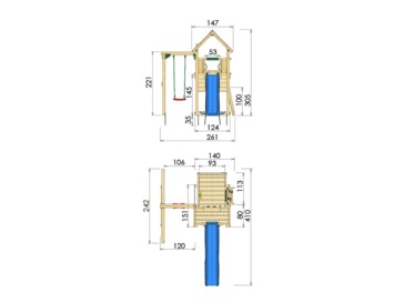 - Oppervlakte van het speeltoestel met glijbaan: 399x153 cm