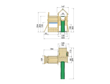 - Oppervlakte van het speeltoestel met glijbaan: 399x153 cm
