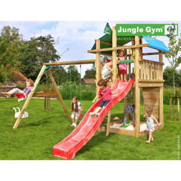 Haal de speeltuin je tuin in met de houten speeltoestellen van Jungle Gym. Dit Jungle Gym fort is een speelparadijs waardoor de kinderen weer graag buiten spelen. Het is een houten speeltoren met een tentdak, klimmuur, ladder, glijbaan, dubbele houten schommel en houten zandbak. De glijbaan is zelfs aan te sluiten op water. Zo maak je er zeer eenvoudig een waterglijbaan van. Ideaal voor de zomerse dagen! Aan de zijkant van dit houten speelhuisje met glijbaan vind je de dubbele schommel. Een klimtoestel met genoeg speelplezier voor de hele buurt dus.