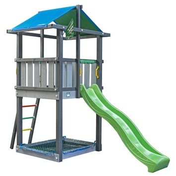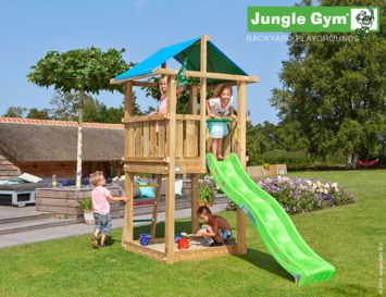De Jungle Hut is een boomhut en een speeltoren tegelijkertijd. De Jungle Hut is afgedekt met een schuin dakje waardoor je ook wanneer het iets slechter weer is op expeditie kunt. Een zandbak om in te spelen een ladder om op het hoger gelegen platform te komen ontbreken uiteraard ook niet. De Hut wordt geleverd in een donker- en lichtgrijze kleur. De lichtgroene glijbaan maakt het tot een waar kleurfestijn in de tuin! De Hut is 2 meter 86 hoog en 1 meter 20 breed. De totale diepte inclusief glijbaan bedraagt 3 meter 18. De Jungle Hut past perfect in de wat kleinere tuin.