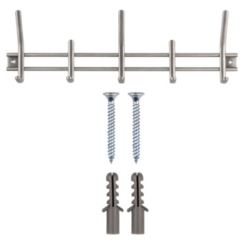 Op zoek naar een RVS-look kapstok? Deze kapstok is van het merk Novidade en heeft 5 haken. De kapstok is gemaakt van metaal en heeft een geborstelde afwerking. Deze kapstok kan gebruikt worden in diverse ruimtes zoals de hal, badkamer en keuken. Deze kapstok heeft een RVS-kleur en wordt geleverdmet schroeven en pluggen.