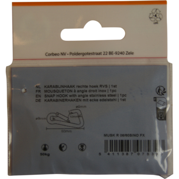 Deze karabijnhaak heeft een lengte van 60mm en een dikte van 6mm, met een rechte hoek. Een karabijnhaak is dankzij het scharnierende deel geschikt om snel en eenvoudig dingen met elkaar te verbinden. Karabijnhaken komen goed van pas als u iets moet zekeren of op een eenvoudige manier aan elkaar moet bevestigen. Door het gebruik van roestvast staal is deze karabijnhaak volledig beschermd tegen roestvorming waardoor hij in goede staat blijft en een lange levensduur gegarandeerd is. De karabijnhaken zijn per stuk verpakt in een blister.