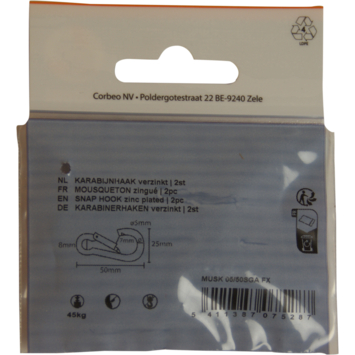 Snel een verbinding maken? Kies dan voor de karabijnhaak 50mm verzinkt 2ST. Een karabijnhaak is dankzij het scharnierende deel geschikt om snel en eenvoudig dingen met elkaar te verbinden. Karabijnhaken komen goed van pas als je iets moet zekeren of op een eenvoudige manier aan elkaar moet bevestigen. Deze haak is gemaakt van verzinkt metaal waardoor corrosie wordt tegengegaan. Op deze manier gaat je haak langer mee en kan hij ook buitenshuis worden gebruikt. Dit artikel is verpakt in een set van 2 stuks. Kortom: eenvoudige verbindingen maak je met deze karabijnhaak.