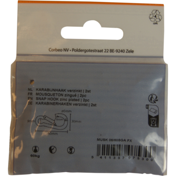 Snel een verbinding maken? Kies dan voor de karabijnhaak verzinkt 60 mm. Deze haak is gemaakt van verzinkt metaal waardoor corrosie wordt tegengegaan. Op deze manier gaat je haak langer mee. De karabijnhaak is bedoeld voor binnenshuis en voorzien van een scharnierend schroefdeel waarmee je eenvoudig dingen met elkaar verbindt en loskoppelt. Dit artikel is verpakt in een set van 2 stuks, dus je hebt altijd een haak achter de hand. Kortom: eenvoudige verbindingen maak je met deze karabijnhaak.