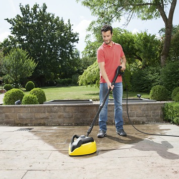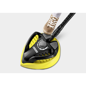 Met de Kärcher terrasreiniger T 450 kunnen grote oppervlakken buitenshuis efficiënt worden gereinigd, zonder opspattend water en tot 50% sneller in vergelijking met een reiniging met een sproeilans. De reden hiervoor is de roterende arm met dubbele straal, waarmee het vuil eenvoudig kan worden verwijderd van grote oppervlakken. Dankzij de extra powersproeier, die indien nodig comfortabel geactiveerd kan worden met een pedaal, kunnen ook hoeken en kantjes efficiënt worden gereinigd. De T 450 is ook uitgerust met een speciaal beschermingsrooster, waarmee u Japanse tuinen en andere kiezeloppervlakken kan reinigen. De druk kan perfect worden ingesteld door de sproeier te draaien naar het object dat moet worden gereinigd. Hierdoor kunnen zowel harde oppervlakken zoals steen en beton als gevoelige oppervlakken zoals hout worden gereinigd. Dankzij het zogenaamde hovercraft-effect, is de T-Racer uiterst eenvoudig te manoeuvreren. En zelfs verticale vlakken zoals garagepoorten kunnen in geen tijd worden gereinigd dankzij de praktische handgreep. De T-Racer T 450 is geschikt voor de Kärcher Home & Garden hogedrukreinigers uit de klasses K 4 – K 7.