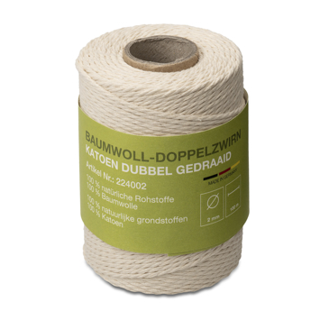 Katoen is een zachte natuurvezel in een gebroken witte kleur. De dubbel twist katoen heeft een diameter van 2mm en een lengte van 100mtr op de rol.