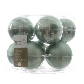Kerstballen glas eucalyptus met een doorsnede van 6 cm. Een box bevat 10 stuks, met zowel glanzende als matte kerstballen. Een mooie bal ter versiering van uw kerstboom of kerstslinger. Vergeet niet uw kerstboomhaakjes.