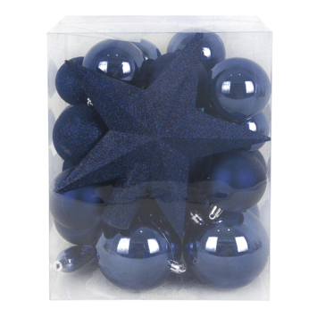 Kerstballen mix inclusief piek gemaakt van plastic. In totaal bevat de verpakking 33 stuks. De mix bestaat uit verschillende kleuren blauw in mat en glans.
