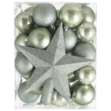Kerstballen mix inclusief piek gemaakt van kunststof. In totaal bevat de verpakking 33 stuks. De mix bestaat uit verschillende kleuren eucalyptus in mat of glans.