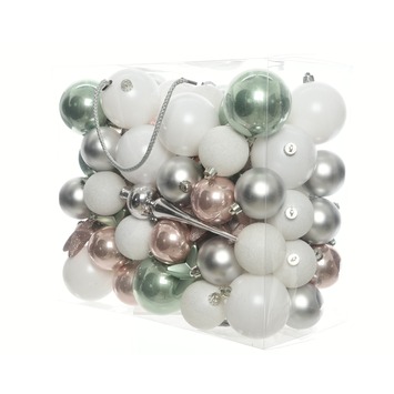 Kerstballenset plastic met piek met een doorsnede van 6 en 8 cm. In box 100 stuks. Kleuren: eucalyptus, zilver, poederroze en winterwit. Een mooie set ter versiering van uw kerstboom of kerstslinger. Vergeet niet uw kerstboomhaakjes.