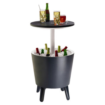 De Cool Bar van Keter is een cocktailtafel met koelvak. De Cool Bar heeft een diameter van 50 centimeter. Gesloten is hij 57 centimeter hoog, open is hij 84 centimeter hoog. Dankzij de Cool Bar heb je altijd een gekoeld drankje bij de hand in je tuin. Inclusief slim waterafvoersysteem
