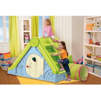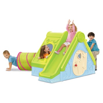 Dit unieke speeltoestel geeft u kinderen uren van plezier. Het toestel is multifunctioneel en heeft meerdere speelopties. Zo kan men de lader opklimmen en aan de andere kant naar beneden glijden van de glijbaan. Daar buiten kan men ook in het huisje spelen. Je kunt in het huisje komen door het raam en de tunnel. Zo kunnen ze de Funtivity hun eigen verstopplaats maken. Het speeltoestel is gemakkelijk op te bouwen en te reinigen. Het is gemaakt van hoogwaardig kunststof waardoor het niet zal gaan rotten of roesten, en dus nauwelijks onderhoud nodig heeft. Dankzij het hoogwaardig kunststof kan het speeltoestel zowel in de zomer als winter buiten blijven staan. Het zal u tuin opvrolijken door de speelse kleuren.