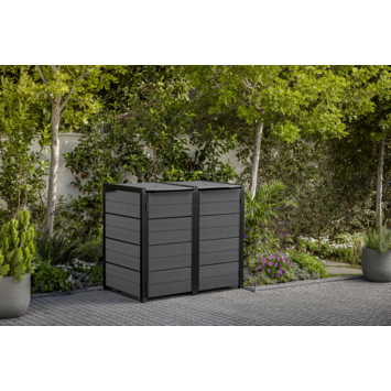 De Keter Hide Away containerberging tuin antraciet 2 x 240 liter helpt je om afvalcontainers netjes weg te werken in je tuin. De berging biedt ruimte voor 2 containers van 240 liter. Je kan de berging uitbreiden wanneer je een extra container wil plaatsen.