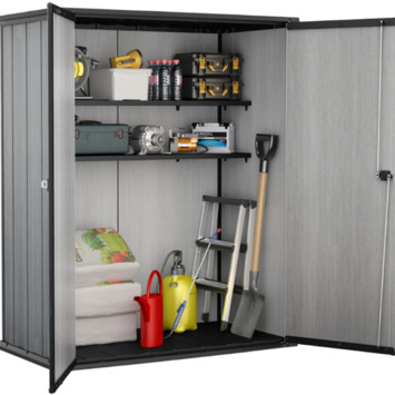 Met de Keter High Store Plus opbergkast geef je je tuin of garage een opgeruimde uitstraling. De kast is gemaakt van Duotech™, een kunststof met een houtlook. Zo krijg je de voordelen van kunststof zonder in te leveren op uitstraling. De kast heeft twee openslaande deuren voor gemakkelijke toegang tot je spullen, zoals tuinkussens en gereedschap. Op het stevige vloerpaneel leg je ook zware spullen neer. De deuren kun je afsluiten met een slot (niet inbegrepen) voor extra veiligheid. Deze kast is weerbestendig en onderhoudsvriendelijk. Je kunt de kast overschilderen met watergedragen acrylverf, zodat hij past bij jouw stijl. Met een formaat van 139,5 x 74 x 170 cm is er genoeg ruimte. Het opbouwen duurt 2 tot 3 uur met twee personen.