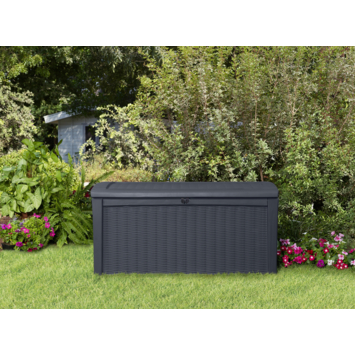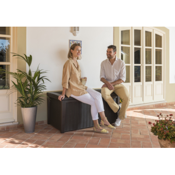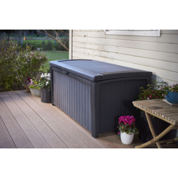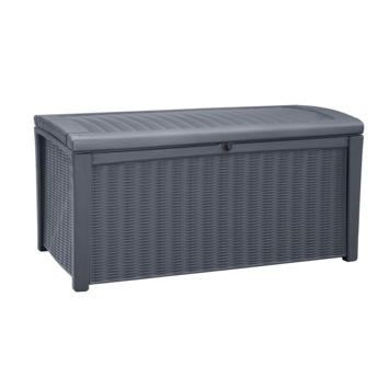 De kussenbox Borneo van Keter is de ideale oplossing om snel en gemakkelijk spullen op te bergen. Met zijn wicker design is deze opbergbox niet alleen zeer praktisch maar ook erg stijlvol waardoor je de box zowel binnen als buiten kan gebruiken. Met zijn grote opslagcapaciteit van 400 liter, is deze berging uitermate geschikt voor tuinkussens, speelgoed of andere tuinspullen. Dankzij de 2 gasveren kan je het deksel gedempt openen en sluiten. Daarnaast kan je deze opbergbox ook gebruiken als bankje. Dankzij het extra verstevigd deksel kunnen er gemakkelijk twee mensen zitten op de Borneo opbergbox.