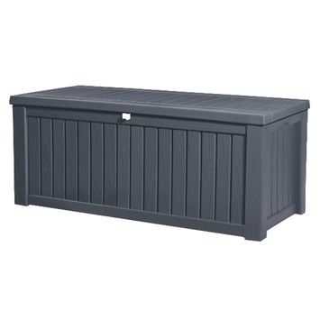 De kussenbox Rockwood van Keter is gemaakt van kunststof en aluminium en is regenwaterdicht. Je kan de box dus buiten laten staan zonder dat de inhoud nat wordt. De box is stevig genoeg om zitruimte voor 2 personen toe te laten. De kussenbox Rockwood van Keter is 155 cm lang, 72 cm breed en 64 cm hoog, wat op een volume van 570 liter neerkomt. Deze designbox met houtnerf is eenvoudig te monteren en heeft een automatisch openingssysteem. De Keter kussenbox Rockwood is dus de ideale aanvulling in jouw tuin.