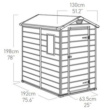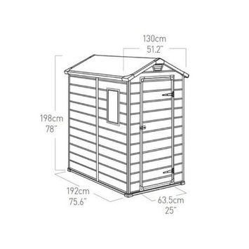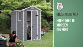 Met het Keter Manor 46S tuinhuis heb je een stevige en ruime opbergplek voor al je tuinspullen. Dit kunststof tuinhuis heeft een buitenmaat van 130 x 192 x 198 cm. Binnen is de ruimte 111 x 177 x 190 cm groot. Dankzij de grote deur met sterke scharnieren haal je makkelijk je spullen in en uit. De dubbele wanden en het versterkte frame zorgen voor extra stevigheid. Wil je je spullen extra beschermen? Dan sluit je de deuren af met een slot (niet inbegrepen). Het huisje is gemaakt van onderhoudsvriendelijk kunststof dat tegen weer en wind kan. Je zet het snel in elkaar met standaard gereedschap. Twee personen zijn ongeveer 2 tot 3 uur bezig met de montage, als de ondergrond vlak is.