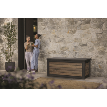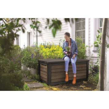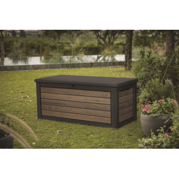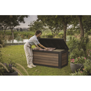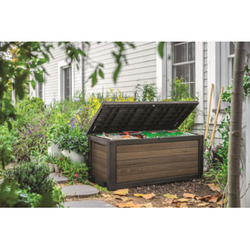 Op zoek naar een stevige opbergbox voor je tuin? De Keter Signature Walnut 630L biedt volop opbergruimte voor tuinkussens en andere tuinaccessoires. Met een draagkracht van 270 kg is de box ook geschikt als extra zitplaats. Het kunststof materiaal heeft de uitstraling van hout, maar is weerbestendig, roestvrij en onderhoudsvrij. Dankzij gasveren opent de box soepel en met de handvaten is de box gemakkelijk te verplaatsen. De box is eenvoudig in elkaar te zetten, zodat je snel van extra opbergruimte kunt genieten!