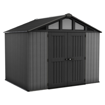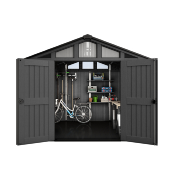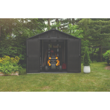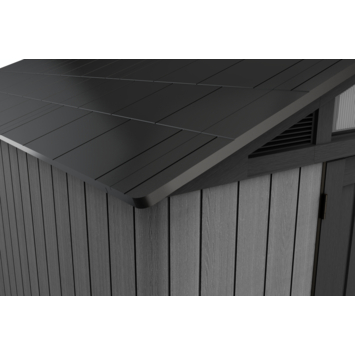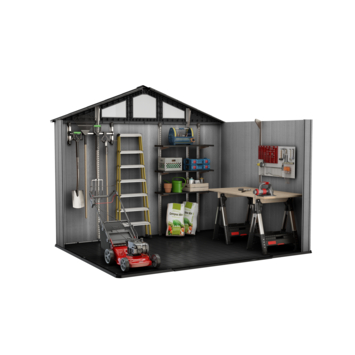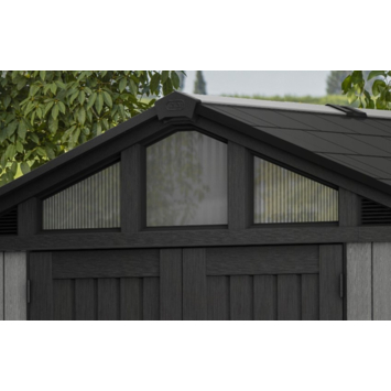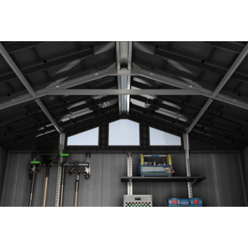 Het Keter Stronghold 108 tuinhuis 305 x 243 x 251 cm is ontworpen voor maximale opslag. De constructie is met staal versterkt en opgebouwd uit dubbelwandige panelen van 19 mm dik. Daardoor is het geschikt voor het opbergen van grote tuinmachines, fietsen en zwaar gereedschap.