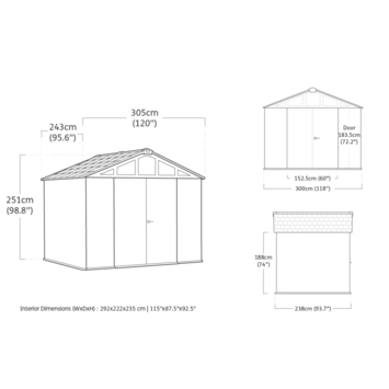 De dubbele deuren zorgen voor een ruime doorgang van 152 cm, zodat je grotere spullen eenvoudig naar binnen rijdt. Met een zijwandhoogte van 251 cm en een nokhoogte van 235 cm biedt het tuinhuis veel binnenruimte. De brede voorzijde van 305 cm maakt het praktisch in te delen, bijvoorbeeld met stellingen.