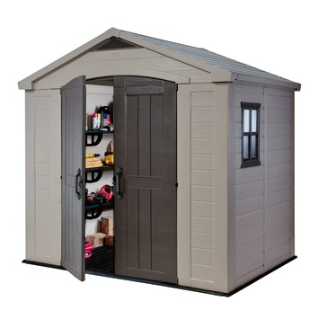 Altijd ruimte tekort in je schuur of garage? Met dit Keter Factor 86 tuinhuis krijg je er in één keer een overdekte opbergruimte bij. Groot genoeg voor je fiets, scooter, tuingereedschap en zelfs een zitmaaier. De dubbele deuren openen extra breed en de vloer loopt schuin af, zodat je spullen makkelijk naar binnen rijdt. Je hoeft je ook geen zorgen te maken over vocht: de bodemplaat houdt alles netjes schoon en droog. Dankzij het raam en de transparante strook in het dak is het overdag licht genoeg om alles snel te vinden. Twee personen zetten het huisje in 2 tot 3 uur in elkaar. Je hebt alleen een vlakke ondergrond nodig.