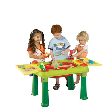 Met deze zand- en waterspeeltafel kunnen kinderen lekker spelen. De tafel kan zowel binnen als buiten staan dankzij het hoogwaardig kunststof. Ook heeft de tafel twee deksels waarmee je de tafel volledig kan afsluiten. De tafel bestaat uit 2 uitneembare bakken die men met zand of water kan vullen. Er kan 15 liter water in en maximaal 30 kilo zand. Dankzij de uitneembare bakken is de tabel ook goed te vullen en schoon te maken. Bij de tafel worden ook een grote beker, vergiet en 2 vormpjes (een ster en een vis) geleverd.