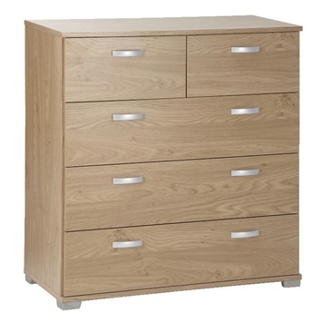Meer opbergruimte nodig voor je kleding, ondergoed of misschien wel papieren? Ga dan voor de Kim ladekast eiken 83x78x39 cm. De kast heeft 3 grote en 2 kleine lades waarin je al jouw spullen netjes en gesorteerd kunt opbergen. De lades van deze ladekast Kim zijn voorzien van een moderne kunststof greep en uitgevoerd met solide metalen ladegeleiders. Hierdoor kun je de lades eenvoudig openen en sluiten. Door het moderne ontwerp van de kast, past deze in vrijwel ieder interieur. De ladekast is uitgevoerd in een eiken print maar is ook leverbaar in andere kleuren. Kortom: ruim al je spullen op in de vijf laden van deze ladekast Kim met eikenhouten print.