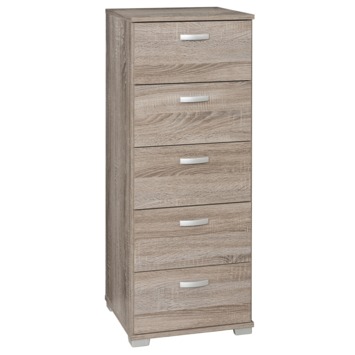 Bezorg jezelf veel opberggemak met de Kim ladekast gelamineerd spaanplaat truffel eiken 101x40x39 cm. De kast heeft 5 handige lades waarin je jouw spullen kunt opbergen. De lades van Kim-ladekast zijn voorzien van een moderne kunststof greep voor een goede grip. Ook is de kast uitgevoerd met solide metalen ladegeleiders. Hierdoor zijn de lades eenvoudig te openen en te sluiten. De kast past bovendien in vrijwel ieder interieur. De ladekast heeft een truffeleiken uiterlijk en is tevens leverbaar in andere kleuren. Kortom: maak je interieur compleet met ladekast Kim.