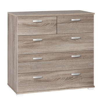 Creëer extra opberggemak met de Kim ladekast gelamineerd spaanplaat truffel eiken 83x78x39 cm. De kast heeft 3 grote en 2 kleine lades waarin je snel en eenvoudig jouw spullen kunt opbergen. De lades van Kim-ladekast zijn voorzien van een moderne kunststof greep en uitgevoerd met solide metalen ladegeleiders. Hierdoor zijn de lades eenvoudig te openen en te sluiten. De kast past in vrijwel ieder interieur. De ladekast heeft een eigentijds truffeleiken uiterlijk en is tevens leverbaar in andere kleuren. Kortom: maak je interieur compleet met deze Kim-ladekast.