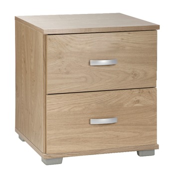Creëer meer sfeer en opberggemak in je slaapkamer met Kim nachtkast gelamineerd spaanplaat eiken 44x40x39 cm. Deze nachtkast is ideaal om je wekker, nachtlamp of favoriete boek op te plaatsen. De kast past bovendien perfect bij andere kasten en kleinmeubelen uit Kim-serie. Dit eikenhouten nachtkastje uit de Kim-serie is voorzien van twee handige lades die extra opbergruimte bieden. Dankzij de fraaie, kunststof handgreep en solide metalen ladegeleiders krijg je de lades makkelijk open en dicht. De kast heeft een eigentijds eiken decor en is tevens leverbaar in andere kleurstellingen. Kortom: berg al je spullen netjes op voor je gaat slapen met het nachtkastje Kim met gelamineerde spaanplaten met een eikenhouten print.