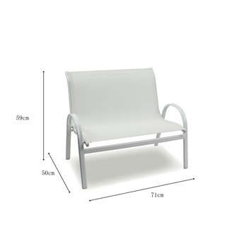 Deze kinder tuinbank is gemaakt van textileen met een metalen frame en in combinatie met de lichte pasteltint heeft deze stoel een zachte uitstraling. Daarnaast is de Kinderbank Lotte Wit Aluminium stapelbaar en licht van gewicht, waardoor deze gemakkelijk op te bergen zijn.