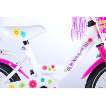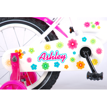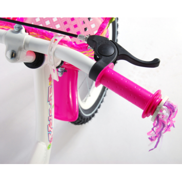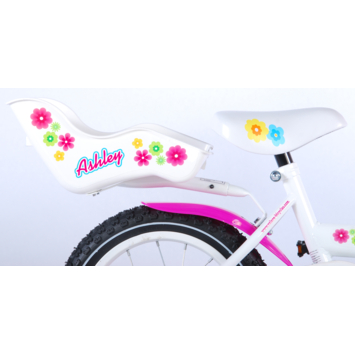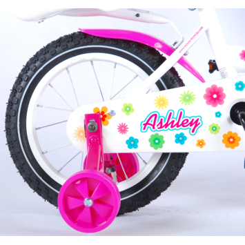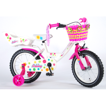 Volare Ashley meisjesfiets 14 inch. De Volare Ashley fietsen zijn geschikt voor alle fleurige dametjes. Zowel het frame van de fiets als het praktische kunststofmandje zijn voorzien van een prachtig bloemetjesdesign. De fiets beschikt over makkelijk afneembare zijwieltjes om snel te kunnen leren fietsen, een stevige handrem en een achteruittraprem. Bovendien heeft de fiets een poppenzitje, zodat ieder dametje haar pop veilig kan vervoeren en zelf haar handjes aan het stuur kan houden. Een top fiets voor een lage prijs! Deze fiets is voor 95% afgemonteerd, dus bijna fietsklaar. Wel zo gemakkelijk!